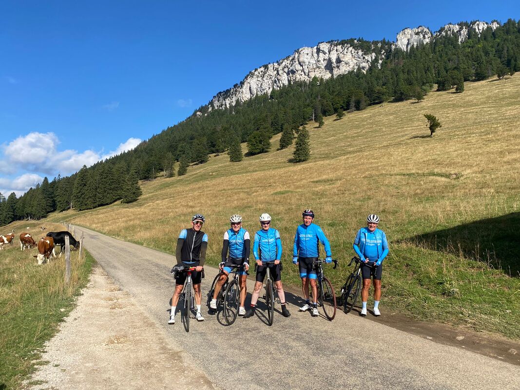 Ce samedi 23 août c’est Jean-Marie C. qui invite à partager sa désormais classique dans le Jura. En voiture jusqu’à Grandson, c’est d’ici que les choses sérieuses commencent. Et assez vite d’ailleurs : par l’ascension du col de l’Aiguillon. Une sacrée bosse au départ de Baulmes pour passer au-dessus des Aiguilles de Baulmes. 690 m’ de montée sur 7,5 km. Les 5 premiers km très durs avec des pourcentages entre 10 et 13% avec même un court passage à 16%. Chapeau les gars ! La suite du parcours en passant par La Côte-aux-Fées, La Brévine, Mauborget est vallonée mais permet d’apprécier les paysages jurassiens. Bravo aux 7 participants.